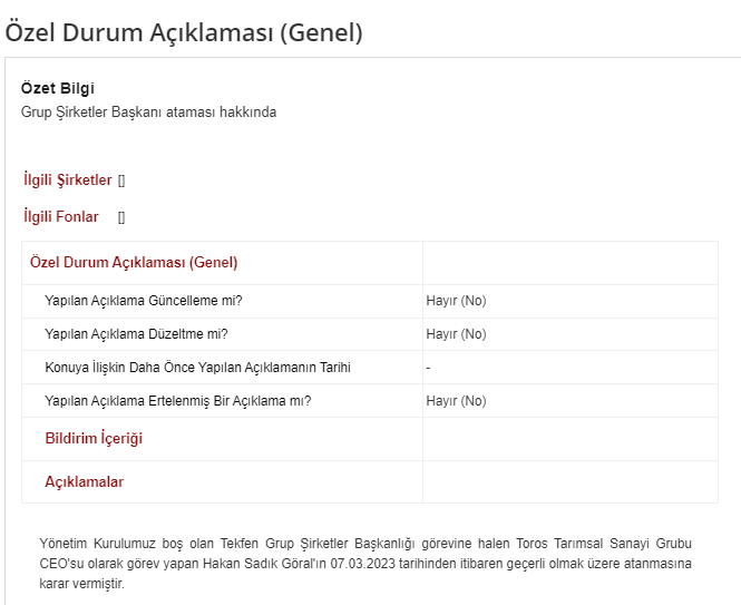 "İdarə Heyətimiz 07.03.2023-cü il tarixindən etibarən Tekfen Qrup Şirkətləri İdarə Heyətinin sədri vakant vəzifəsinə hazırda "Toros Tarımsal Sanayi Grubu"nun Baş direktoru olan Hakan Sadık Göralın təyin edilməsinə qərar verib", - açıqlamada bildirilir.