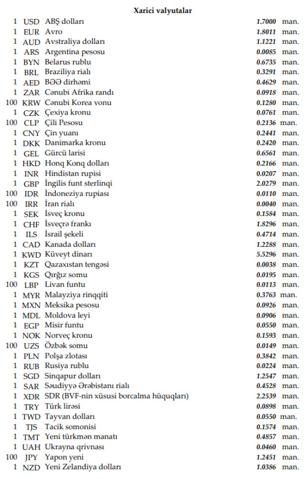 Mərkəzi Bank rəsmi məzənnələr açıqladıAzərbaycan Respublikasının Mərkəzi Bankı xarici valyutaların 10.03.2023 -cü il tarixindən etibarən Azərbaycan manatına qarşı RƏSMİ MƏZƏNNƏLƏRİ BÜLLETENİ