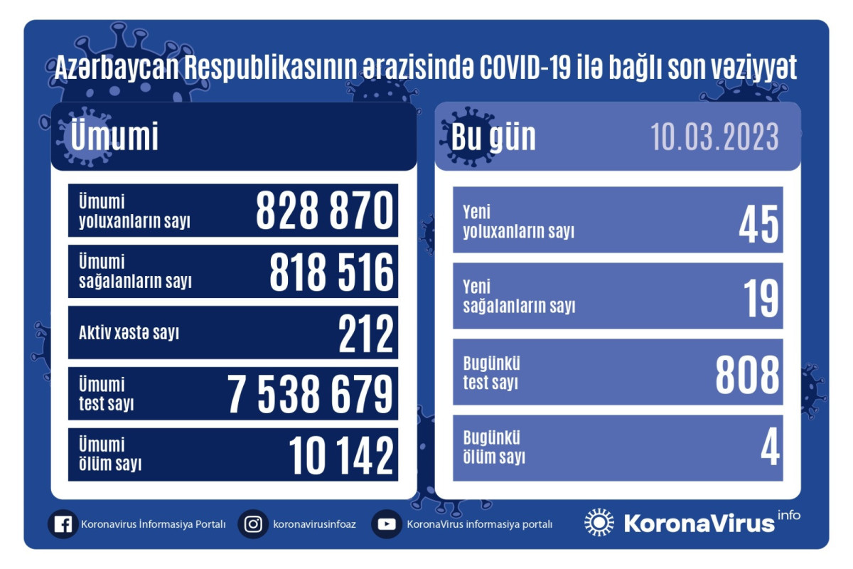 Azərbaycan Respublikasında koronavirus (COVID-19) infeksiyasına 45 yeni yoluxma faktı qeydə alınıb, 19 nəfər müalicə olunaraq sağalıb.