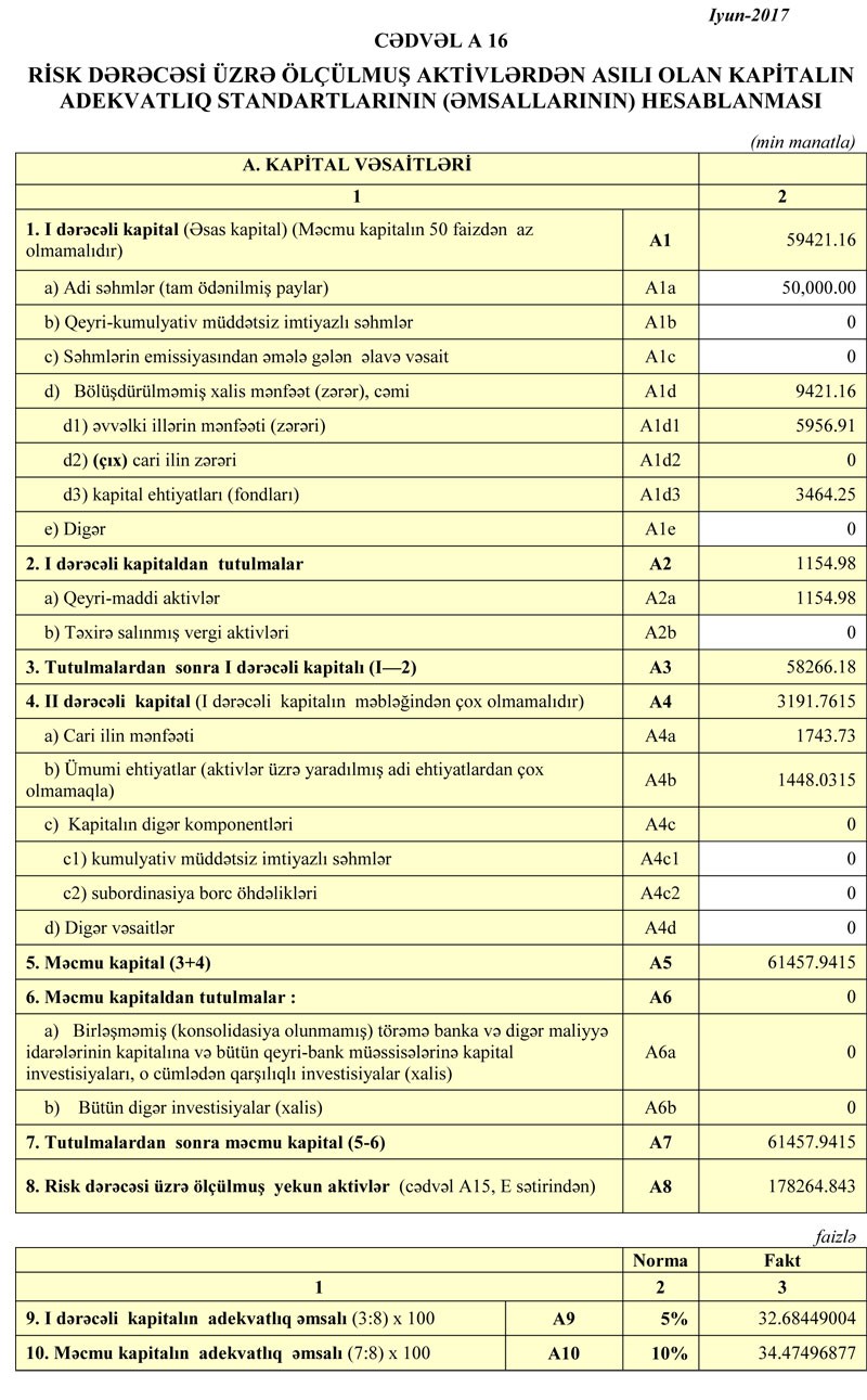 30 İyun 2017-ci il tarixində “Ziraat Bank Azərbaycan” ASC 154,4 milyon manat aktivlərə, 91,8 milyon manat öhdəliklərə, 62,6 milyon manat cəmi balans kapitalına və 61,5 milyon manat məcmu kapitala malik olub. Bank ötən ilin sonunda 132 milyon 195 min manat cəmi aktivlərə, 71 milyon 566 min manat cəmi öhdəliklərə və 60 milyon 629 min manat cəmi kapitala malik idi.