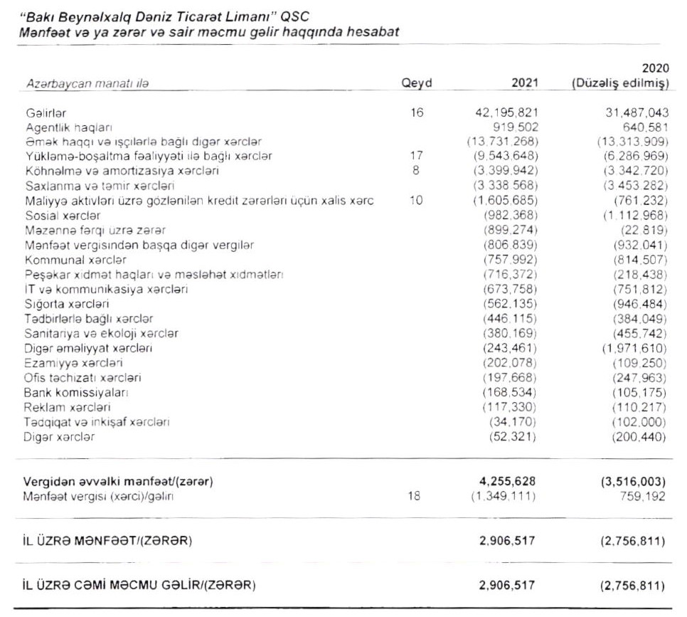 Bakı Limanı 2021-ci ildə təxminən 3 milyon manat xalis mənfəət əldə edib“Bakı Beynəlxalq Dəniz Ticarət Limanı” QSC (Bakı Limanı) 2021-ci ili 2 milyon 907 min manat xalis mənfəətlə başa vurub. Halbuki, səhmdar cəmiyyəti 2020-ci ildən 2,757 milyon manat xalis zərərlə çıxmışdı.
