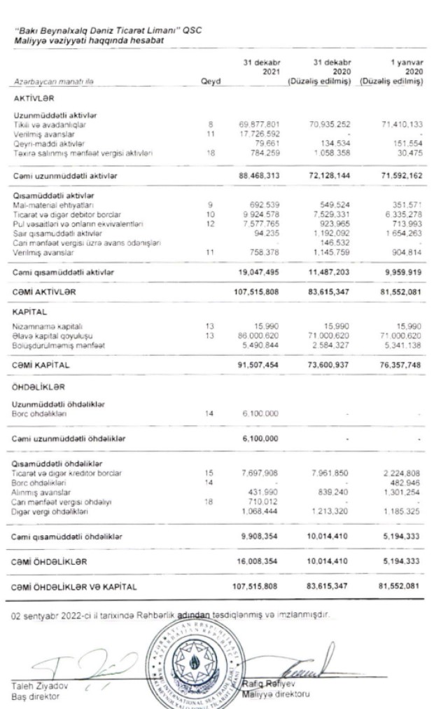 2022-ci il yanvarın 1-nə Bakı Limanının aktivləri 107,516 milyon manat olub ki, bu da illik müqayisədə 28,6 % çoxdur. Hesabat dövründə qurumun öhdəlikləri 60 % artaraq 16,008 milyon manata, balans kapitalı isə 24,3 % artaraq 91,507 milyon manata çatıb.
