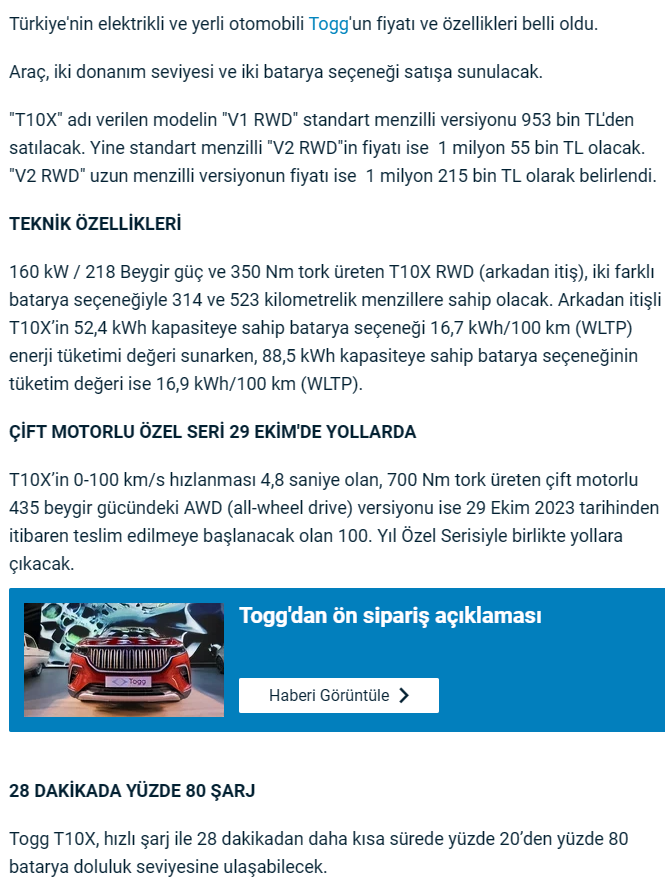 Türkiyənin elektrikli və yerli avtomobili Togg-un qiyməti və xüsusiyyətləri məlum olub. Markanın "T10X" modelinin "V1 RWD" baza versiyasının qiyməti 953 min TL-yə (85 min 389 manat) satılacaq. "V2 RWD" versiyasının qiyməti 1 milyon 55 min TL (94 min 528 manat) olacaq. "V2 RWD" uzun mənzilli versiyasının qiyməti isə 1 milyon 215 min TL (108 min 864 manat) olaraq müəyyən edilib.Türkiyənin Türkiyənin elektrikli və yerli avtomobili Togg-un qiyməti açıqlanıb.