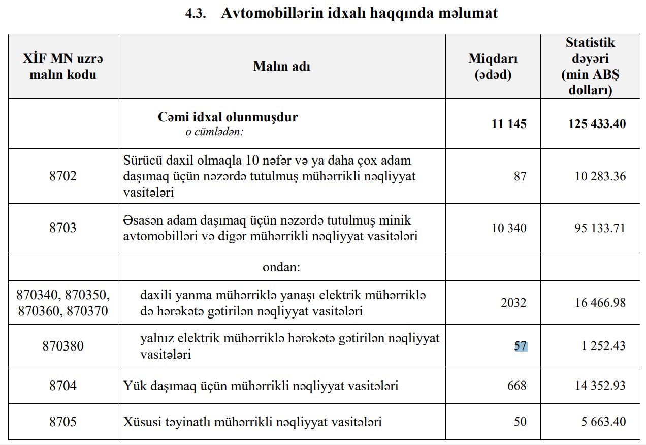 2023-cü ilin ilk 2 ayında Azərbaycana yalnız elektrik mühərriklə hərəkətə gətirilən 222 elektromobil gətirilib. Ötən ilin ilk iki ayında bu say 57 ədəd idi.