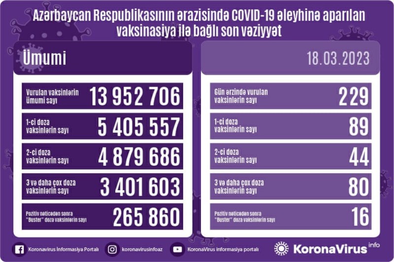 Azərbaycanda son sutkada koronavirus (COVID-19) əleyhinə 229 vaksin vurulub. Bir gündə birinci mərhələ üzrə vaksinasiya olunanların sayı 89, ikinci mərhələ üzrə vaksinasiya olunanların sayı 44, üç və daha çox doza üzrə vaksinasiya olunanların sayı 80, pozitiv nəticədən sonra buster doza üzrə vaksinasiya olunanların sayı 16 nəfərdir.