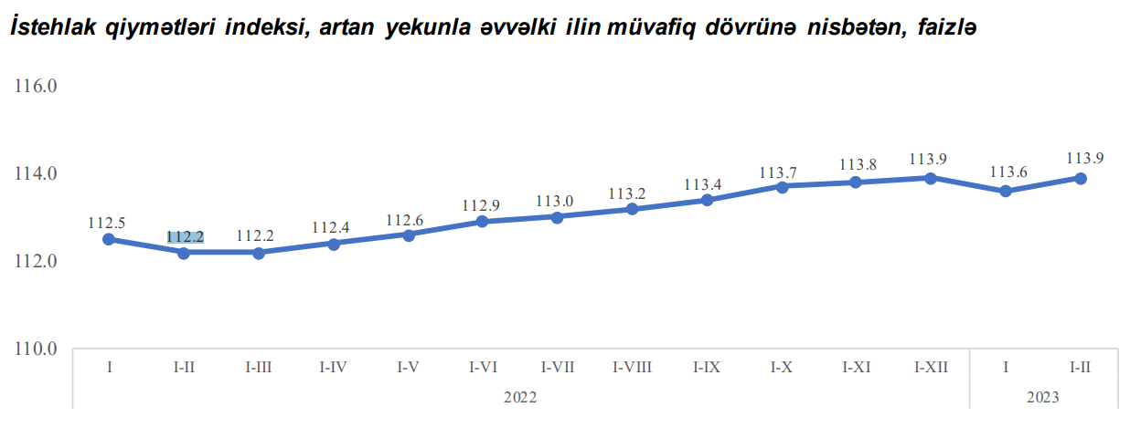 Dövlət Statistika Komitəsinin yaydığı məlumata görə, 2023-cü ilin fevral ayında istehlak qiymətləri indeksi (inflyasiya göstəricisi) 2022-ci ilin fevral ayına nisbətən 14,1 faiz artıb. 2023-cü ilin yanvar-fevral aylarında istehlak qiymətləri indeksi 2022-ci ilin yanvar-fevral aylarına nisbətən 13,9 faiz yüksəlib. Göründüyü kimi, Azərbaycanda inflyasiya Mərkəzi Bankın hədəfindən (4±2%) xeyli yüksəkdir. Mərkəzi Bankın məqsədi inflyasiyanı səngitmək və hədəfinə endirməkdir.