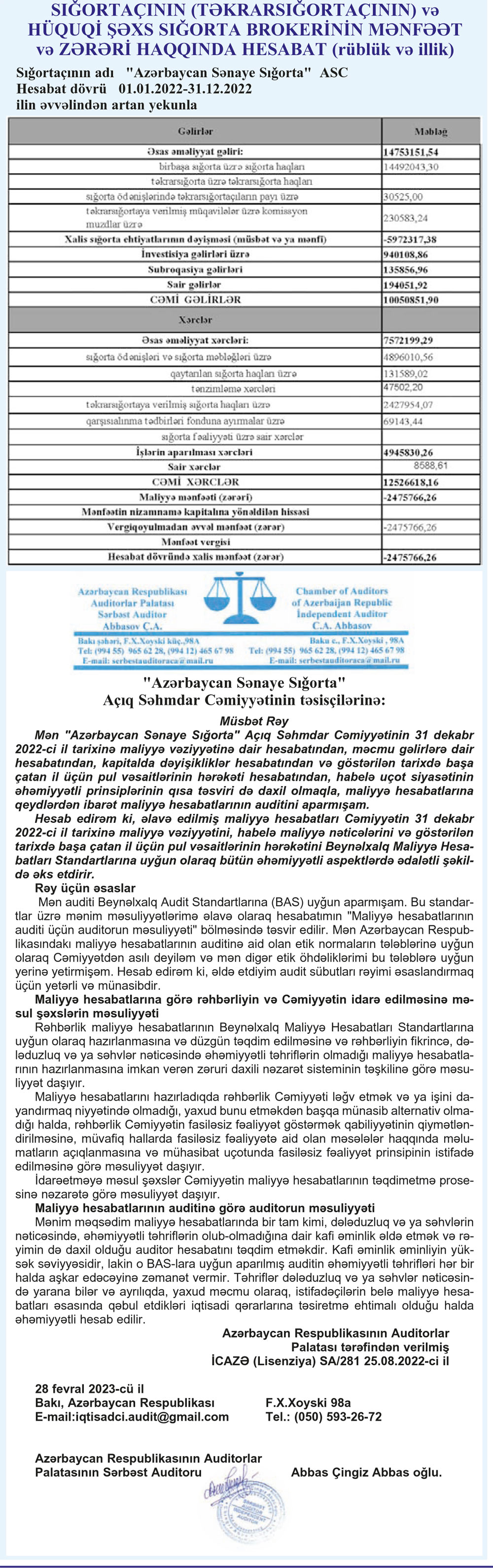 "Azərbaycan Sənaye Sığorta" ASC 2022-ci ili 2 milyon 476 min manat xalis zərər ilə başa vurub. Şirkət 2021-ci ili 1 milyon 984 min manat xalis mənfəət ilə bağlamışdı
