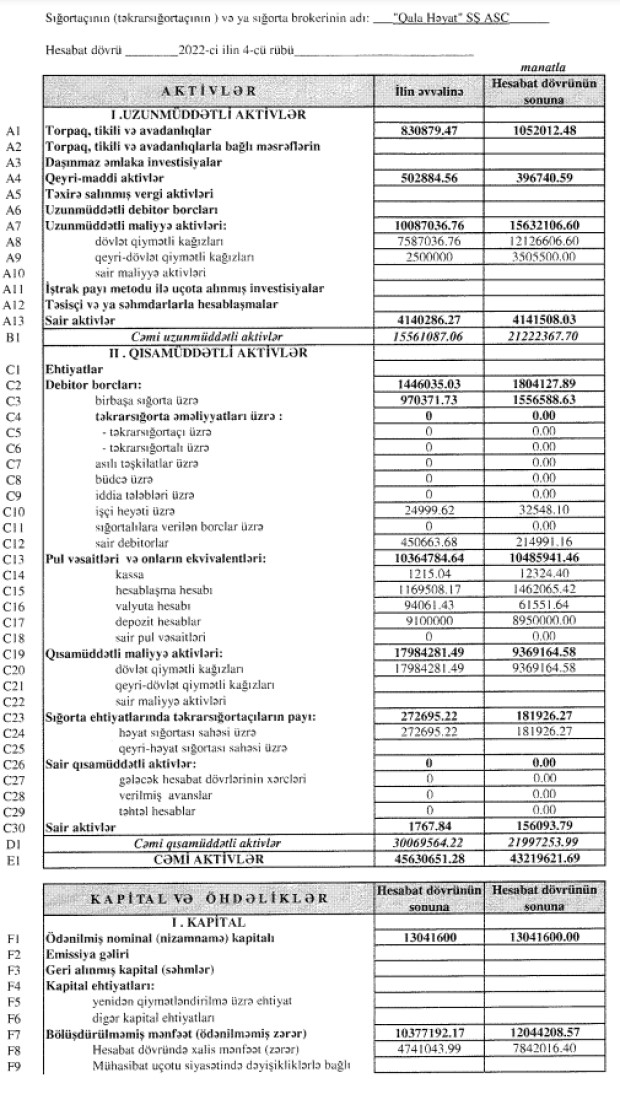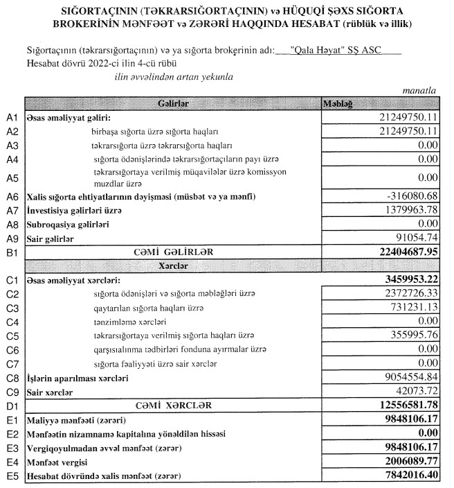 "Qala Həyat" 2021-ci ildə 19 milyon 184 min manat sığorta haqları yığmışdırsa, 2022-ci ildə 21 milyon 250 min manat toplayıb.