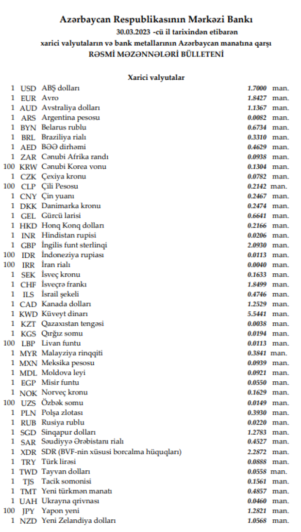 Dolların bazar ertəsi üçün rəsmi məzənnəsi müəyyən olunub