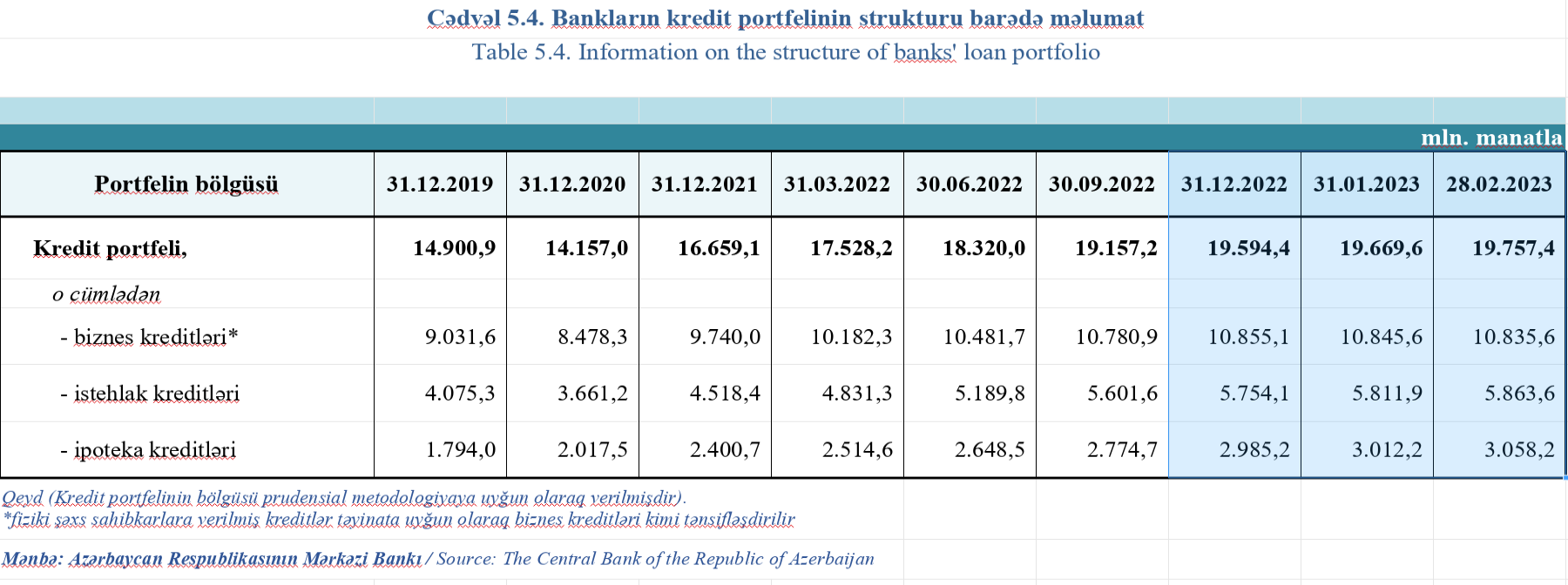 Bankların kredit portfeli əhali tərəfindən götürülən istehlak və ipoteka kreditlərinin hesabına artıb. Bankların biznes kreditləri portfeli azalıb.