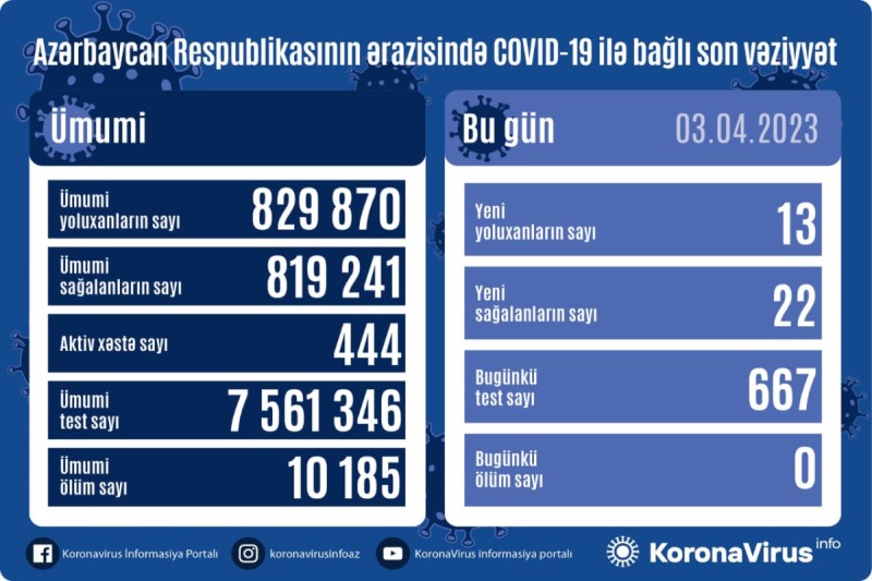 Azərbaycan Respublikasında koronavirus (COVID-19) infeksiyasına 13 yeni yoluxma faktı qeydə alınıb, 22 nəfər müalicə olunaraq sağalıb.