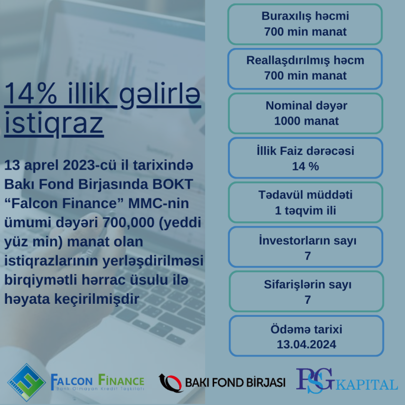 13 aprel 2023-cü il tarixində Bakı Fond Birjasında BOKT “Falcon Finance” MMC-nin tədavül müddəti 1 təqvim ili, nominal dəyəri 1,000 manat olan AZ2001025322 dövlət qeydiyyat nömrəli, 700 min manat həcmində, faizli, təmin edilməmiş sənədsiz, adlı istiqrazlarının yerləşdirilməsi üzrə hərrac yekunlaşıb.