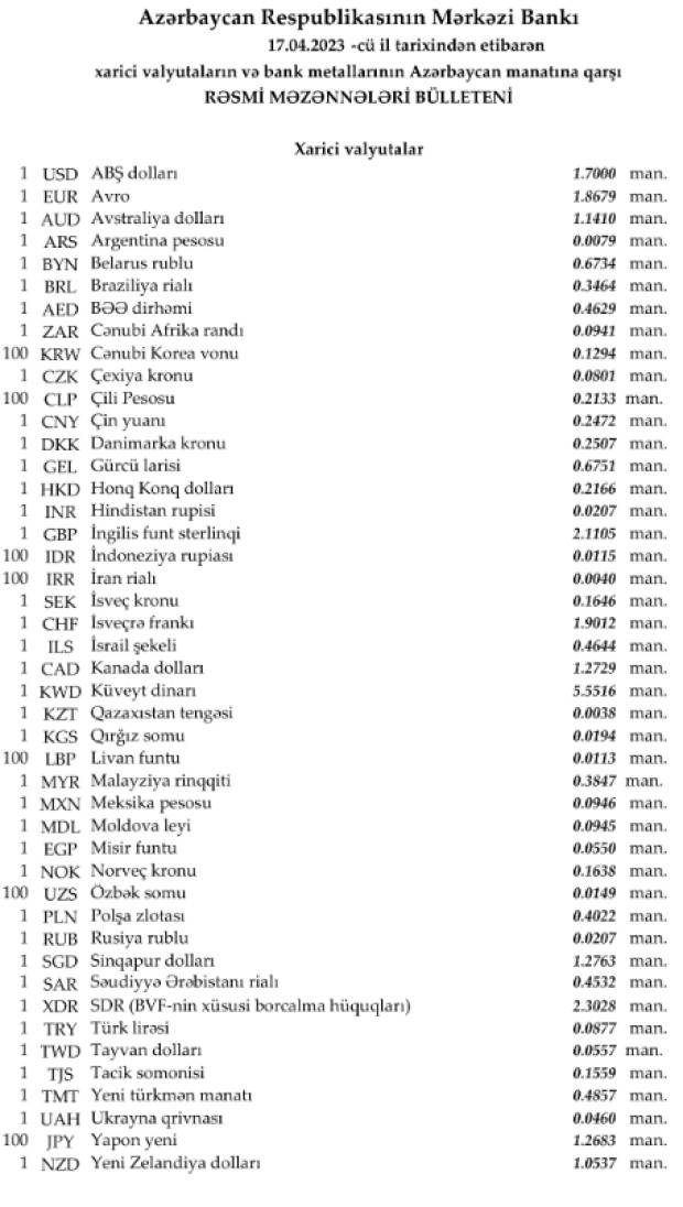 Dolların bazar ertəsi üçün rəsmi məzənnəsi müəyyən olunub