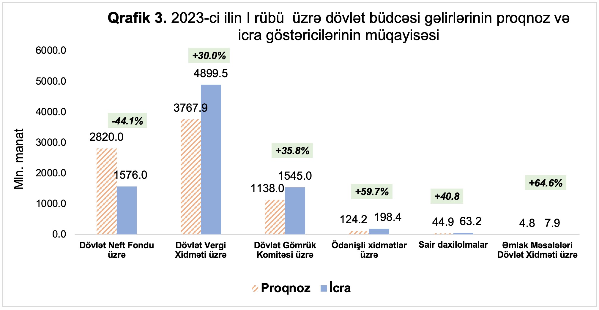 2023-cü ilin I rübü üzrə dövlət büdcəsinin gəlirləri 7 milyard 908,8 milyon manat proqnoza qarşı 8 milyard 290 milyon manat təşkil etmişdir ki, bu da proqnozla müqayisədə 381,2 milyon manat və ya 4,8 faiz, 2022-ci ilin müvafiq dövrü ilə müqayisədə isə 18,3 faiz və ya 1 milyard 280,4 milyon manat çoxdur. Hesabat dövründə icrası təmin edilmiş gəlirlər cari ilin dövlət büdcəsi gəlirlərinin 26,9 faizini təşkil edir ki, bu da ötən ilin müvafiq dövrü ilə müqayisədə 2,9 faiz bəndi çoxdur.