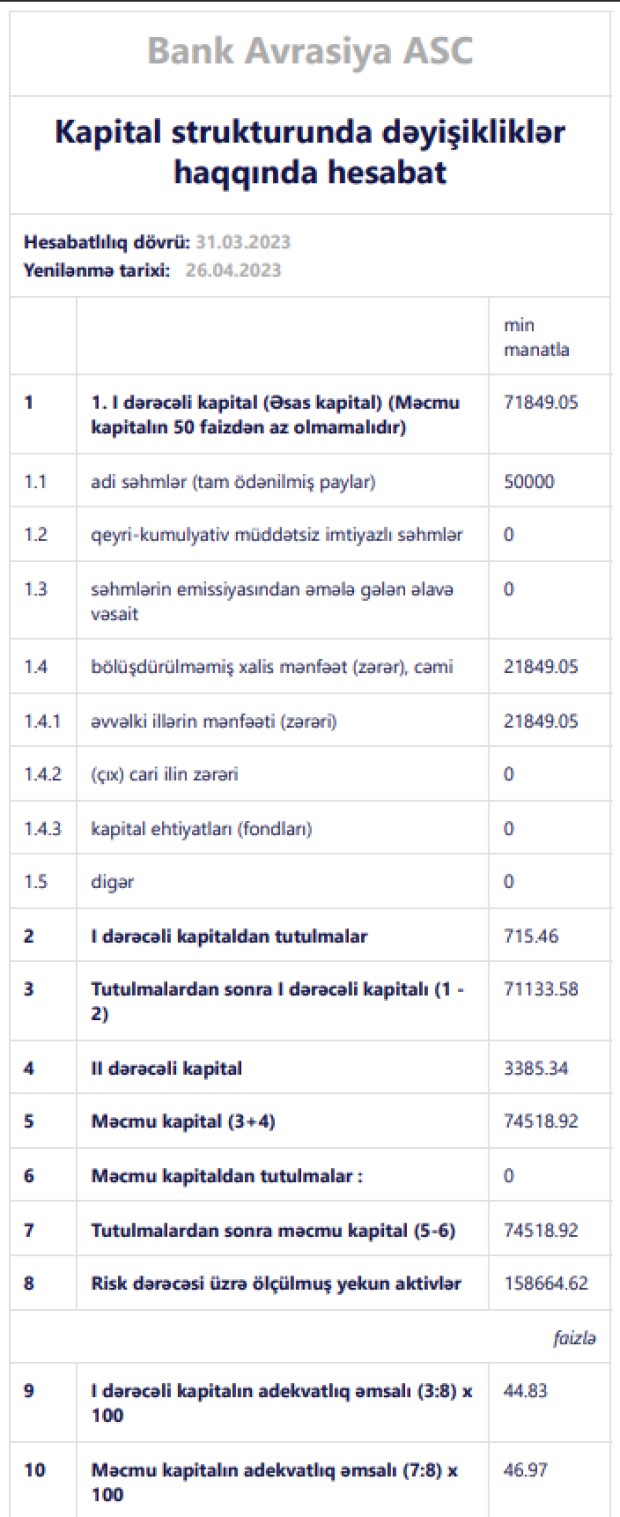 31 Mart 2023-cü il tarixində "Bank Avrasiya" 74 milyon 519 min manat məcmu kapitala malik olub.