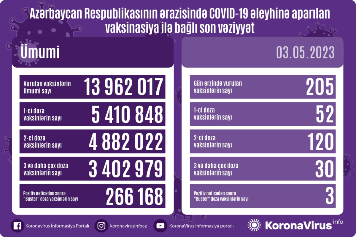 Azərbaycanda son sutkada koronavirus (COVID-19) əleyhinə 205 vaksin vurulub.