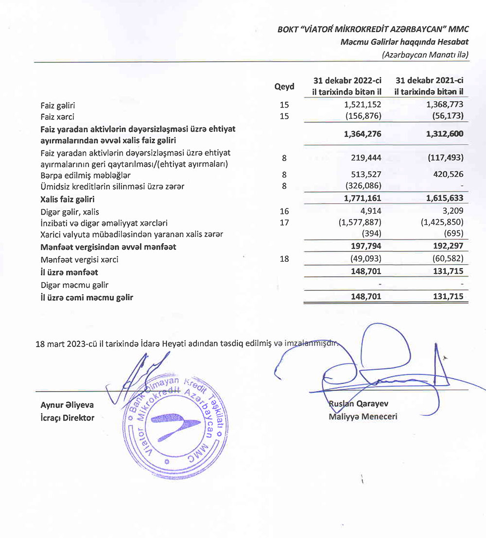BOKT "Viator Mikrokredit Azərbaycan" MMC-nin 2022 - ci ilin sonuna olan maliyyə və audit hesabatıBank Olmayan Kredit Təşkilatı "Viator Mikrokredit Azərbaycan" MMC 2022-ci ili 148 min 701 manat xalis mənfəət ilə başa vurub. Təşkilat 2021-ci ili 131 min 715 manat xalis mənfəət ilə bağlamışdı.