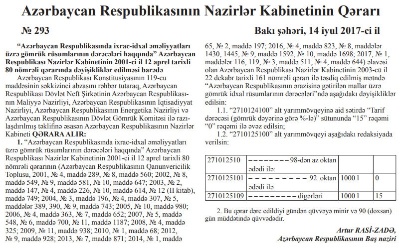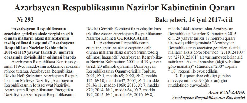 Azərbaycana gətirilən 92 oktan ədədi ilə benzin idxal rüsumundan azad edilib. Bundan başqa benzinlər üçün aksiz dərəcələri 1 ton üçün 200 manatdan 1 manata endirilib.