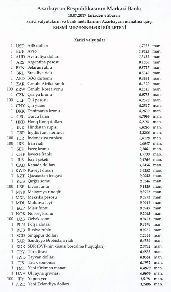 İyulun 18-nə Mərkəzi Bankın açıqladığı rəsmi Dollar/manat məzənnəsi İyulun 17-i ilə müqayisədə dəyişməyərək 1,7022 manat olub, Avro/manat məzənnəsi isə 1.9623 manata qalxıb.