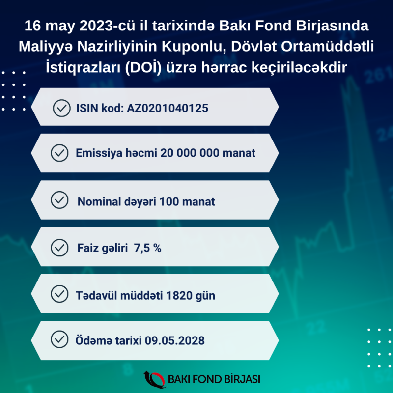 Maliyyə Nazirliyinin istiqrazlarının yerləşdirilməsi üzrə hərrac keçiriləcəkdir16 may 2023-cü il tarixində Bakı Fond Birjasında Maliyyə Nazirliyinin Dövlət Ortamüddətli İstiqrazları (DOİ) üzrə hərrac keçiriləcəkdir.