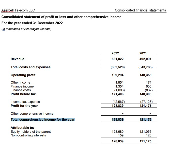 Müqayisə üçün qeyd edək ki, 2021-ci ildə Azercell-in cəmi əməliyyat gəlirləri 492 milyon 871 min manat, cəmi əməliyyat xərcləri 344 milyon 568 min manat, əməliyyat mənfəəti 148 milyon 303 min manat, ödədiyi mənfəət vergisi 27 milyon 128 min manat təşkil etmişdi.