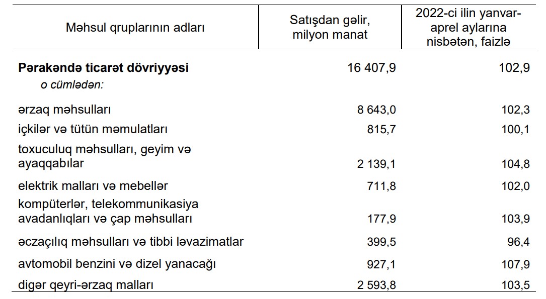Dövlət Statistika Komitəsinin yaydığı məlumata görə, 2022-ci ilin yanvar-aprel ayları ilə müqayisədə pərakəndə ticarət dövriyyəsi real ifadədə 2,9 faiz, o cümlədən ərzaq məhsulları, içkilər və tütün məmulatları üzrə 2,1 faiz, qeyri-ərzaq malları üzrə 4,0 faiz artmışdır.