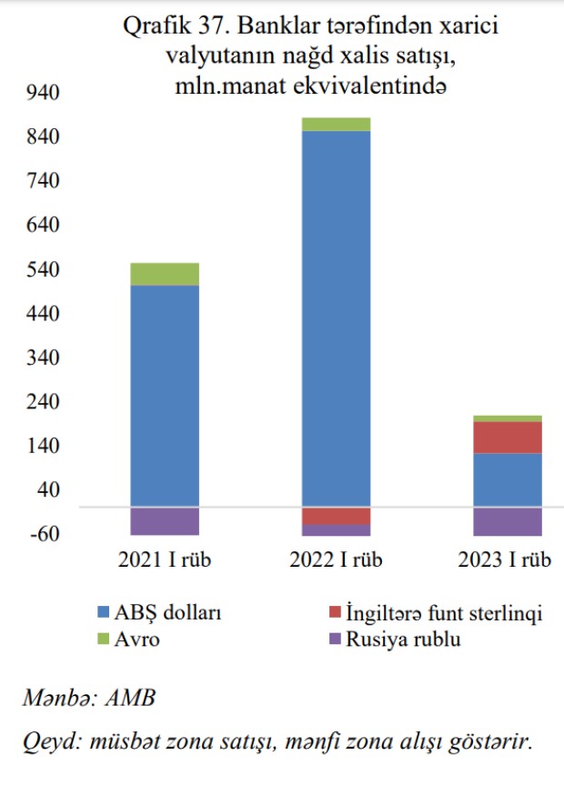 Banklar tərəfindən nağd xarici valyutanın alqı-satqısı üzrə aparılmış əməliyyatların həcmi ötən ilin müvafiq dövrünə nəzərən 19.7% azalaraq 971 mln. ABŞ dolları ekvivalentində olmuşdur. Bunun 83.1%-ni ABŞ dolları ilə aparılmış əməliyyatlar təşkil etmişdir. Rüb ərzində xarici valyutanın xalis satışı ötən ilin I rübünə nəzərən 6 dəfə azalmışdır.