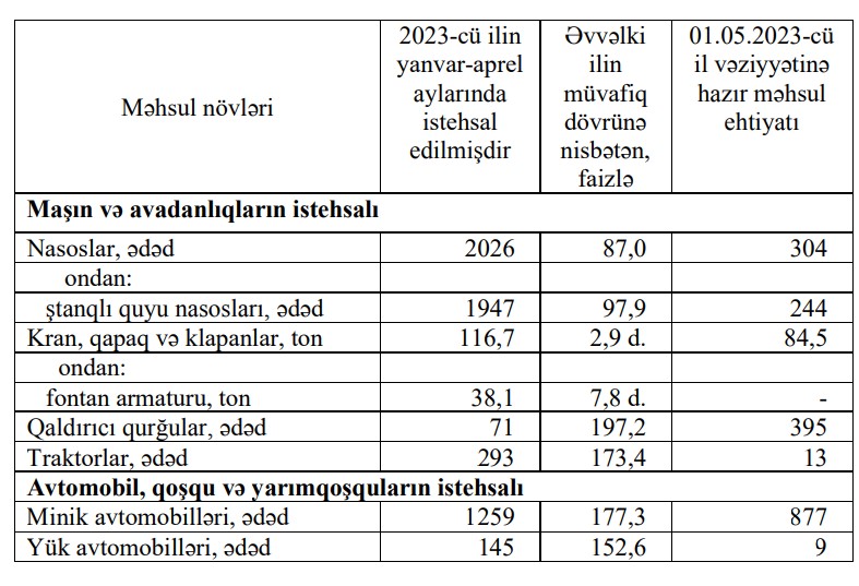 2023-сü ilin yanvar-aprel aylarında 145 ədəd yük avtomobilləri istehsal olunub ki, bu da ötən ilin eyni dövrü ilə müqayisədə 52,6 çoxdur. 01.05.2023-cü il vəziyyətinə hazır məhsul ehtiyatı 9 ədəd təşkil edib.