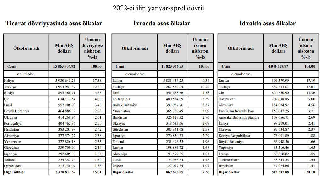 Azərbaycan ən çox malları Rusiyadan alır2023-cü ilin ilk 4 ayında Azərbaycanın Rusiyadan malların idxalının dəyəri 1 milyard 37 milyon 744 min dollar təşkil edib. Bu, 2022-ci ilin ilk 4 ayı ilə müqayisədə 343 milyon 165 min dollar və ya 49,4% çoxdur. 2022-cü ilin ilk 4 ayında Azərbaycanın Rusiyadan malların idxalının dəyəri 694 milyon 579 min dollar təşkil etmişdi.