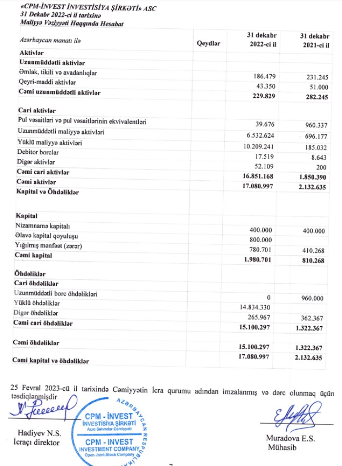 2022-ci ildə “CPM İnvest İnvestisiya Şirkəti”nin cəmi aktivləri 8 dəfə artaraq 17 milyon 81 min manata yüksəlib. Kəskin artım uzunmüddətli və yüklü maliyyə aktivlərinin artmasından qaynaqlanır.