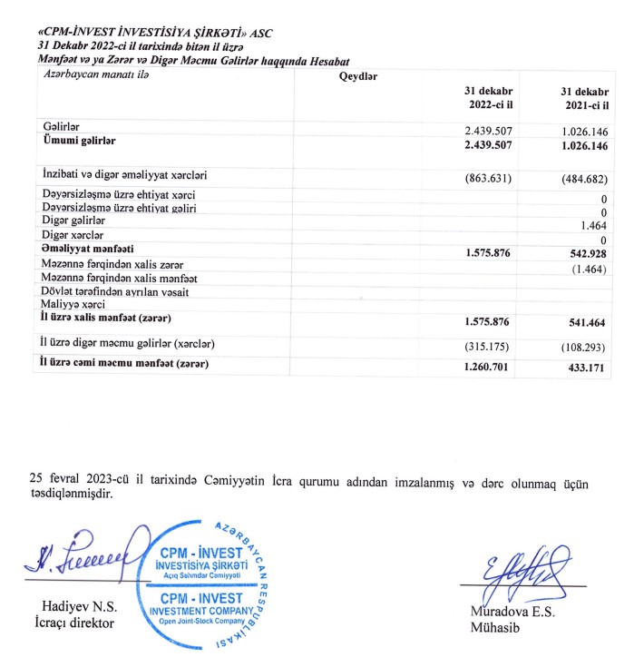 “CPM İnvest İnvestisiya Şirkəti” ASC 2022-ci ili 1 milyon 261 min manat xalis mənfəət ilə başa vurub. ASC 2021-ci ili 433 min manat xalis mənfəət ilə bağlamışdı. Beləliklə, “CPM İnvest"in xalis mənfəəti 2022-ci ildə 2021-ci illə müqayisədə 2,9 dəfə artıb.