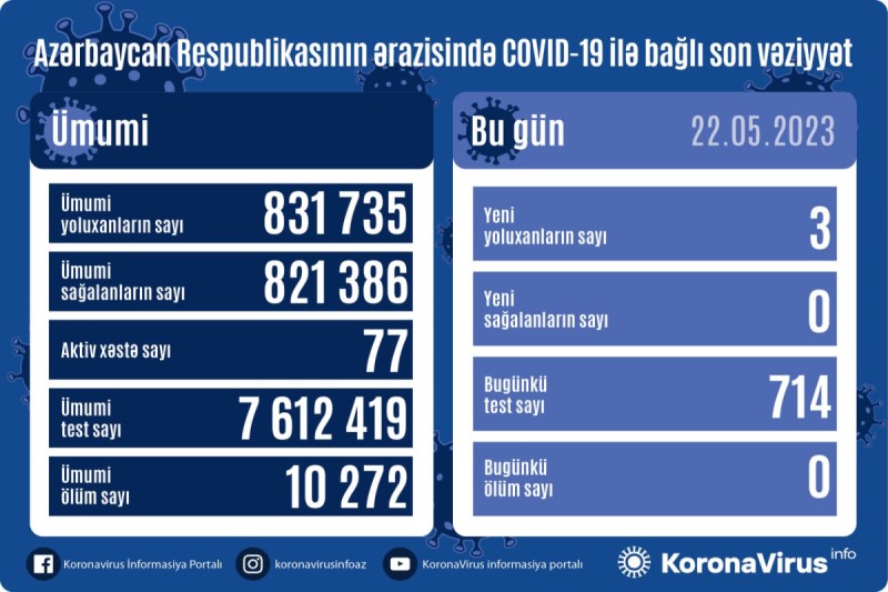 Azərbaycan Respublikasında koronavirus (COVID-19) infeksiyasına 3 yeni yoluxma faktı qeydə alınıb.
