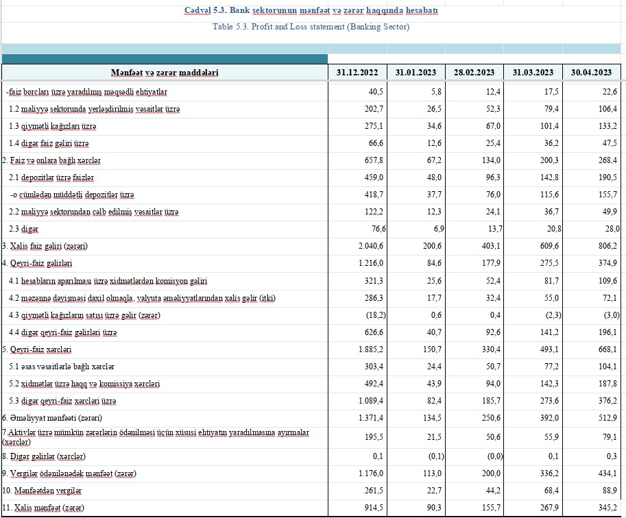 Azərbaycanın bank sektoru 2023-cü ilin ilk 4 ayını 345 milyon 194 min manat xalis mənfəət ilə başa vurub. Bu, ötən ilin eyni dövrü ilə müqayisədə 39% və ya 97 milyon 94 min manat çoxdur. Azərbaycanın bank sektoru 2022-ci ilin ilk 4 ayını (yanvar-aprel) 248 milyon 100 min manat xalis mənfəət ilə bağlamışdı.