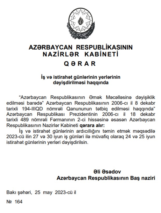 Qərara əsasən, iş və istirahət günlərinin ardıcıllığını təmin etmək məqsədilə 2023-cü ilin 27 və 30 iyun iş günləri ilə müvafiq olaraq 24 və 25 iyun istirahət günlərinin yerləri dəyişdirilib.