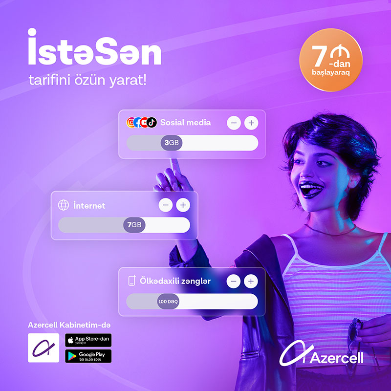 Xatırladaq ki, “IstəSən” tarifi abunəçilərin sərbəst dizayn edə biləcək ilk və yeganə rəqəmsal tarifdir və bura ölkədaxili dəqiqələr, ümumi internet və Instagram, Facebook, YouTube və TikTok kimi əlavə internet paketləri daxildir. Tarifin qiyməti əsas paketin üzərinə edilən əlavələrə əsasən dəyişir və artırdıqca daha sərfəli olur. Tarif dizaynına dəyişiklikləri yalnız özünəxidmət tətbiqi olan “Kabinetim”-də etmək olar.