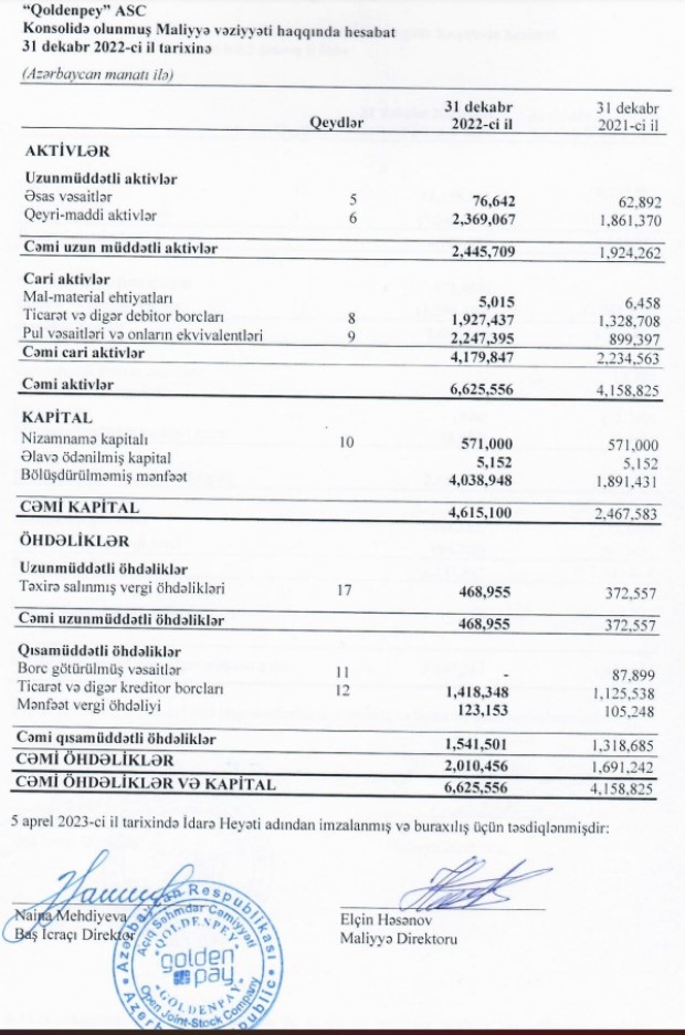 Marja.az Şirkətin audit olunmuş maliyyə hesabatlarına istinadən xəbər verir ki, 2021-ci ildə "QoldenPey"in gəlirləri 8 milyon 397 min manat ikən, 2022-ci ildə 11 milyon 155 min manata yüksəlib (2 milyon 758 min manat və ya 32,8% artıb).