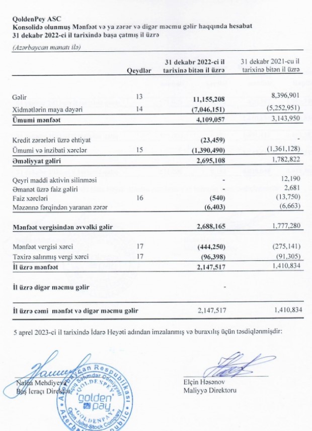 Azərbaycanın onlayn ödəmələr bazarında ən böyük şirkət "QoldenPey" ASC 2022-ci ili 2 milyon 147 min manat xalis mənfəət ilə başa vurub. Şirkət 2021-ci ili 1 milyon 411 min manat calis mənfəət ilə bağlamışdı. Beləliklə, "QoldenPey"in xalis mənfəəti 2022-ci ildə 2021-ci illə müqayisədə 737 min manat və ya 52,2% (1,5 dəfə) artıb. Xalis mənfəətin artması gəlirlərin artmasından qaynaqlanır.