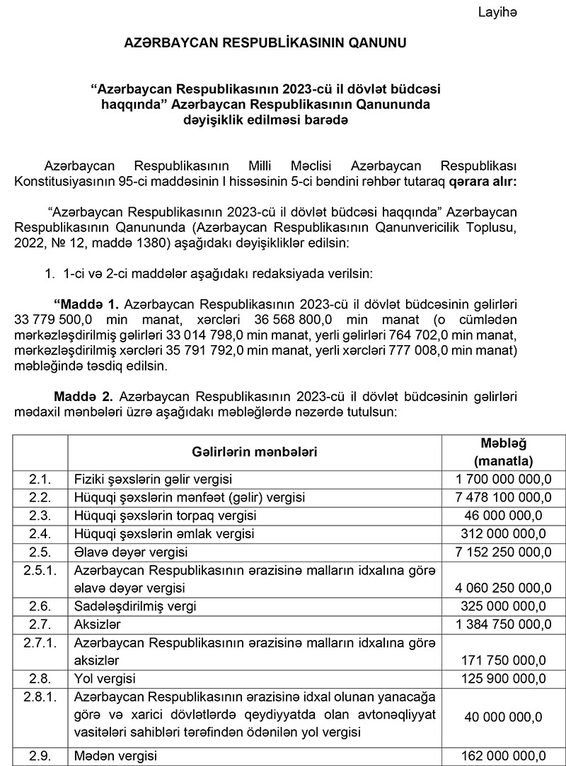 2023-cü ilin dövlət və icmal büdcələrinə dəyişikliklərin edilməsi ilə bağlı qanun layihəsi Milli Məclisə təqdim olunub. Yenidən baxılmış 2023-cü il dövlət büdcəsinin gəlirləri 33 milyard 779,5 milyon manat proqnozlaşdırılır ki, bu da təsdiq olunmuş göstəriciyə nisbətən 3 milyard 5,5 milyon manat və ya 9,8 faiz çoxdur. Yenidən baxılmış 2023-cü il dövlət büdcəsinin xərcləri 36 milyard 568,8 milyon manat məbləğində proqnozlaşdırılır ki, bu da təsdiq olunmuş göstəriciyə nisbətən 3 milyard 215,5 milyon manat və ya 9,6 faiz, 2022-ci ilin faktiki icra göstəricisi ilə müqayisədə isə 4 milyard 504,2 milyon manat və ya 14,0 faiz çoxdur.Azərbaycan Respublikasının Prezidenti tərəfindən Milli Məclisə “Azərbaycan Respublikasının 2023-cü il dövlət büdcəsi haqqında” Azərbaycan Respublikasının Qanununda dəyişikliklər edilməsi barədə” Qanun layihəsi göndərilib.