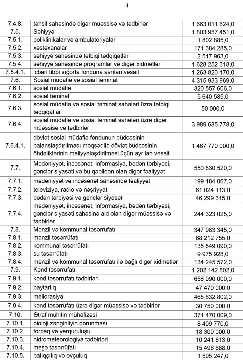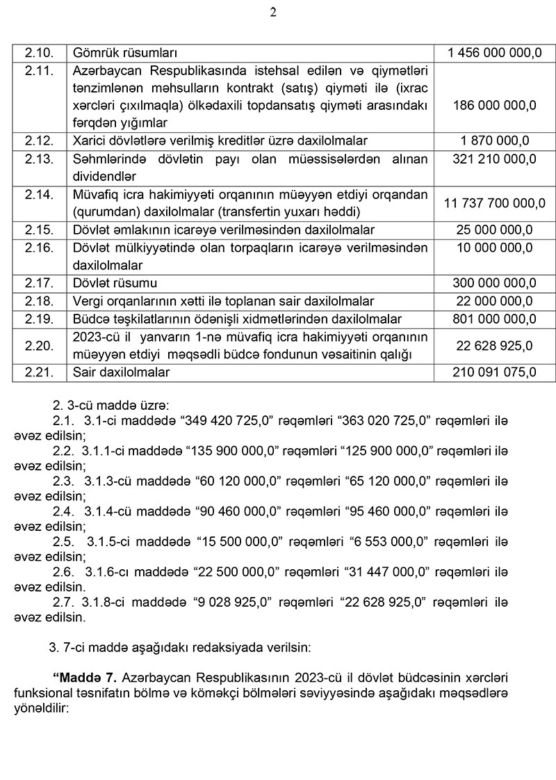 - Azərbaycan Respublikasının işğaldan azad olunmuş Qarabağ və Şərqi Zəngəzurda həyata keçirilən tikinti, bərpa və yenidənqurma işlərinin sürətləndirilməsi ilə bağlı xərclərinin artımı üçün 2 milyard 260 milyon manat. Artımdan sonra bu xərc 5 milyard 260 milyon manat məbləğində olacaqdır;