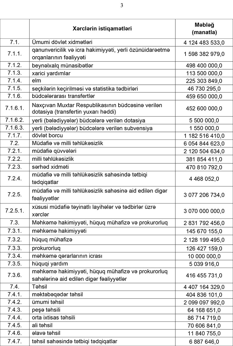 - bəzi büdcə təşkilatlarının maddi-texniki təminatının yaxşılaşdırılması, Naxçıvan Muxtar Respublikasının bəzi dövlət orqanlarının maliyyələşdirilməsinin Muxtar Respublikanın büdcəsindən çıxarılaraq dövlət büdcəsinin mərkəzləşdirilmiş xərcləri hesabına təmin edilməsi və digər zəruri dövlət xərclərin maliyyə təminatı 101,8 milyon manat.