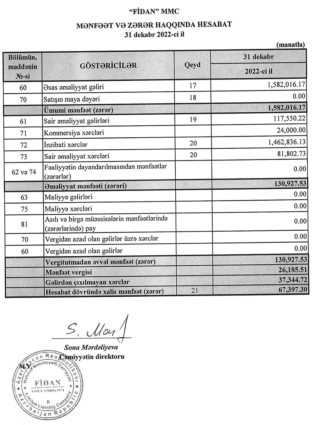 "FİDAN" MMC 2022-ci ili 67 min 397 manat xalis mənfəət ilə başa vurub.