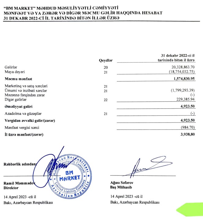 "Megastore" supermarketlər şəbəkəsini idarə edən "BM-Market" MMC şirkəti 2022-ci ili 3 min 939 manat xalis mənfəət ilə başa vurub.