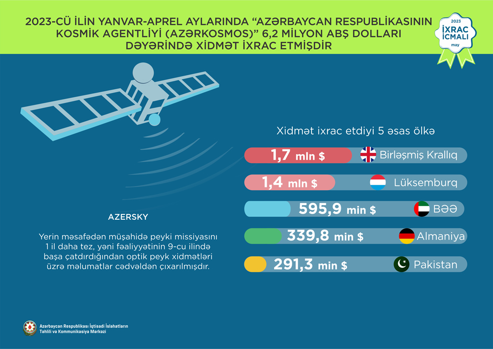 2023-cü ilin yanvar-aprel aylarında Azərbaycan Respublikasının Kosmik Agentliyi (“Azərkosmos”) tərəfindən dünyanın 42 ölkəsinə 6,2 milyon ABŞ dolları dəyərində peyk telekommunikasiya xidmətləri ixrac edilib.