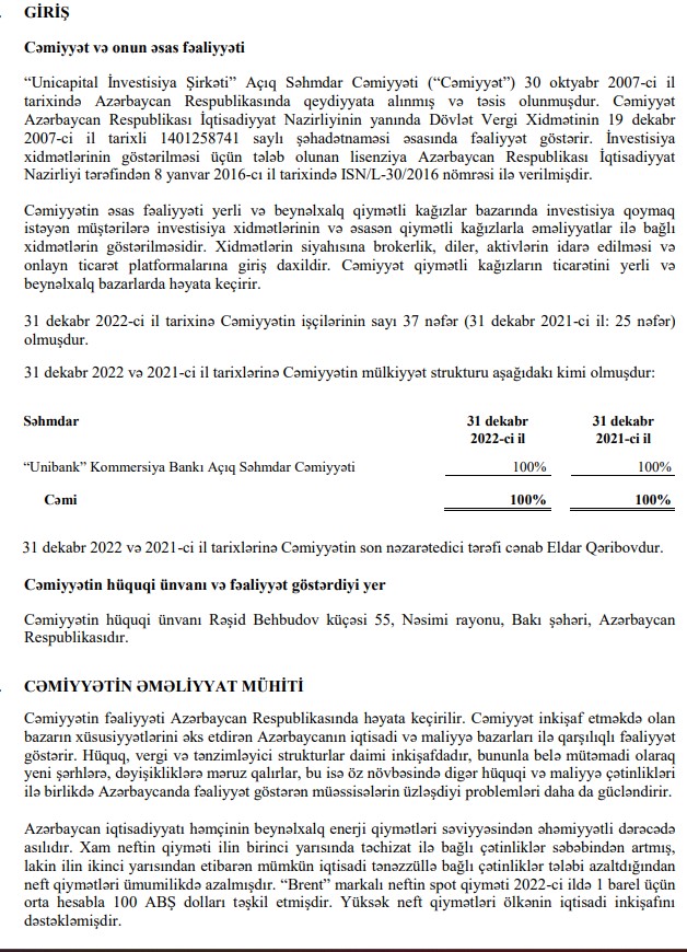 “Unicapital İnvestisiya Şirkəti” ASC 100%-i olmaqla “Unibank” Kommersiya Bankı Açıq Səhmdar Cəmiyyətinə məxsusdur.