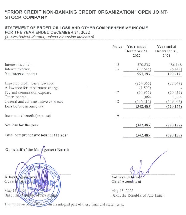 "Prior Kredit BOKT" ASC 2022-ci il üzrə maliyyə hesabatlarını açıqlayıb.