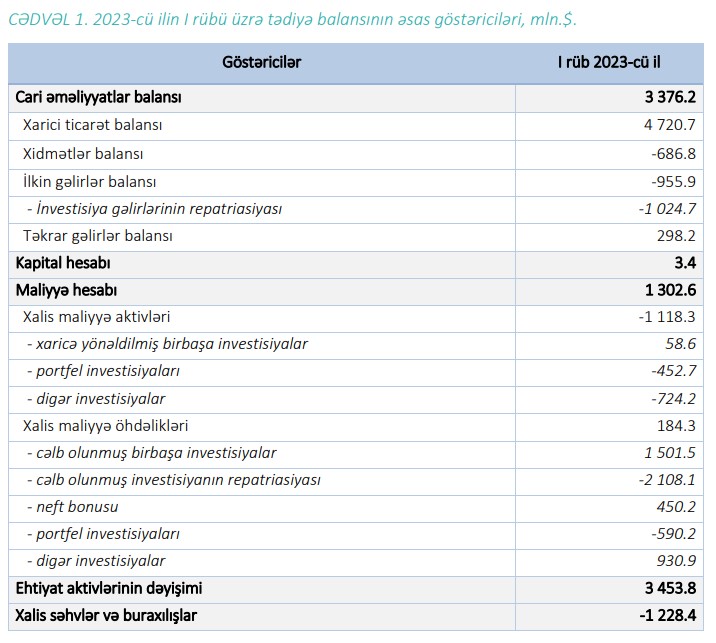 2023-cü ilin 1-ci rübü üzrə Azərbaycanın tədiyə balansı açıqlandı. Cari əməliyyatlar balansında profisit azalıb, ehtiyat aktivlər artıb. Bu ilin 1-ci rübündə Azərbaycanın cari əməliyyatlar balansının (CƏB) ümumi qalığı 3 milyard 376,2 milyon ABŞ dolları təşkil edib. Bu, ötən ilin eyni dövrü ilə müqayisədə 14,6 % azdır. Bu ilin 1-ci rübündə Azərbaycanın tədiyyə balansının ümumi qalığı 3 milyard 453,8 milyon ABŞ dolları təşkil edib. Bu, ötən ilin eyni dövrü ilə müqayisədə 2,2 dəfə çoxdur.2023-cü ilin 1-ci rübü üzrə tədiyə balansı əsasən neft və qaz qiymətlərinin əlverişli olması, qeyri-neft-qaz ixracının artması və kapitalın və maliyyənin hərəkəti hesabında müsbət meyllərdən təsirlənmişdir.