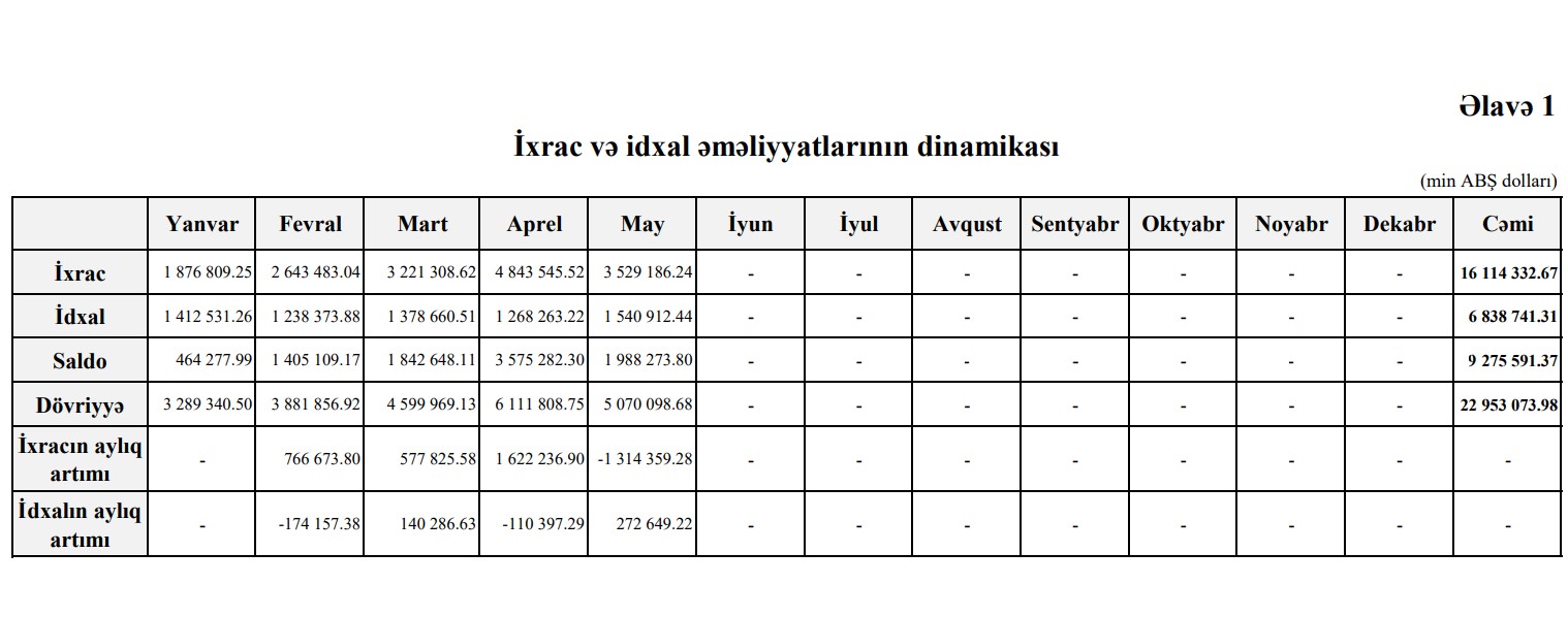 2023-cü ilin ilk 5 ayı ərzində (yanvar-may) Azərbaycanın xarici ticarət əməliyyatlarının həcmi 22 milyard 953 milyon 73 min ABŞ dolları təşkil eib.