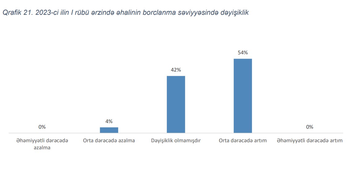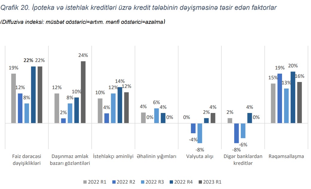 Qeyd edilib ki, tələbin artımının əsas drayverləri daşınmaz əmlak bazarı ilə bağlı gözləntilər, faiz dərəcələri, habelə, rəqəmsallaşma olmuşdur. Cari ilin ilk rübündə əhalinin borclanmasının banklar tərəfindən qiymətləndirilməsinə əsasən əhalinin borclanma səviyyəsində artım müşahidə edilmişdir. Belə ki, sorğuya əsasən 42% bank əhalinin borclanmasında dəyişiklik olmadığını qeyd etsədə, 54% bank əhalinin borclanma səviyyəsinin orta dərəcədə artdığını, 4% bank isə orta dərəcədə azalma olduğunu bildirmişdir.