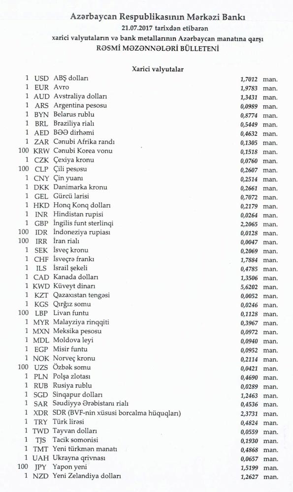 İyulun 21-nə Mərkəzi Bankın açıqladığı rəsmi Dollar/manat məzənnəsi İyulun 20-si ilə müqayisədə düşərək 1,7012 manat olub, Avro/manat məzənnəsi isə 1.9783 manata qalxıb.