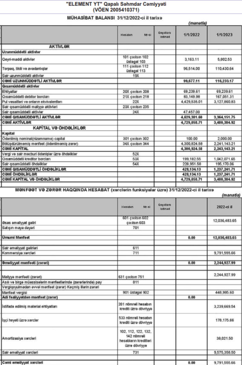Dövlət qurumlarının keçirdiyi tenderlərdə tez-tez qalib olan “Element YT” QSC şirkəti 2022-ci ili 1 milyon 796 min manat xalis mənfəət ilə başa vurub. Şirkət 2021-ci il üzrə maliyyə göstəricilərini açıqlamadığından müqayisə mümkün olmur.